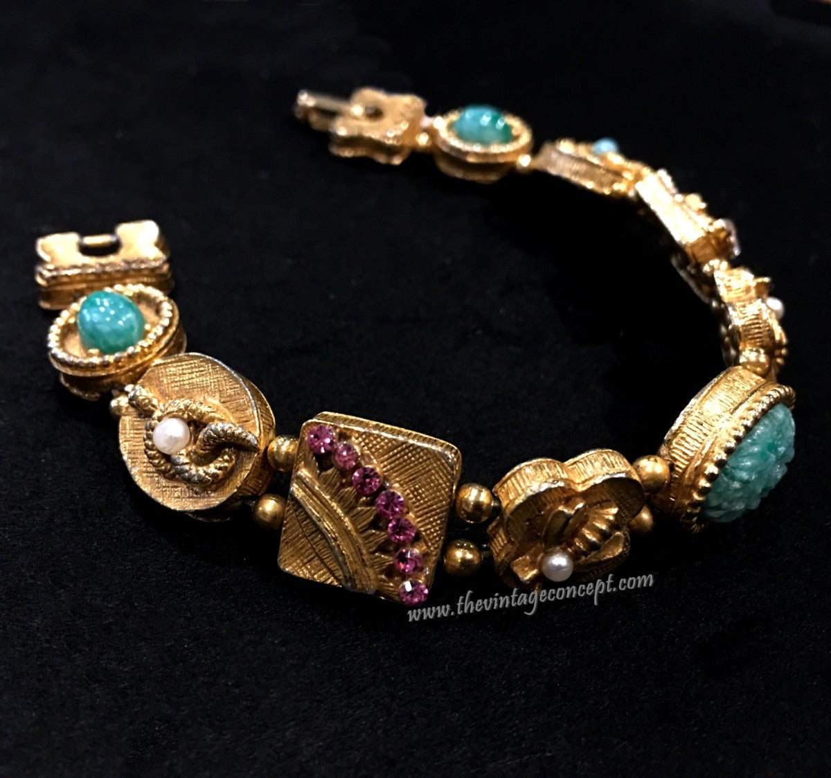 1950's Goldette Carved Green Glass Stone & Charms Gold Plated Bracelet (SOLD)