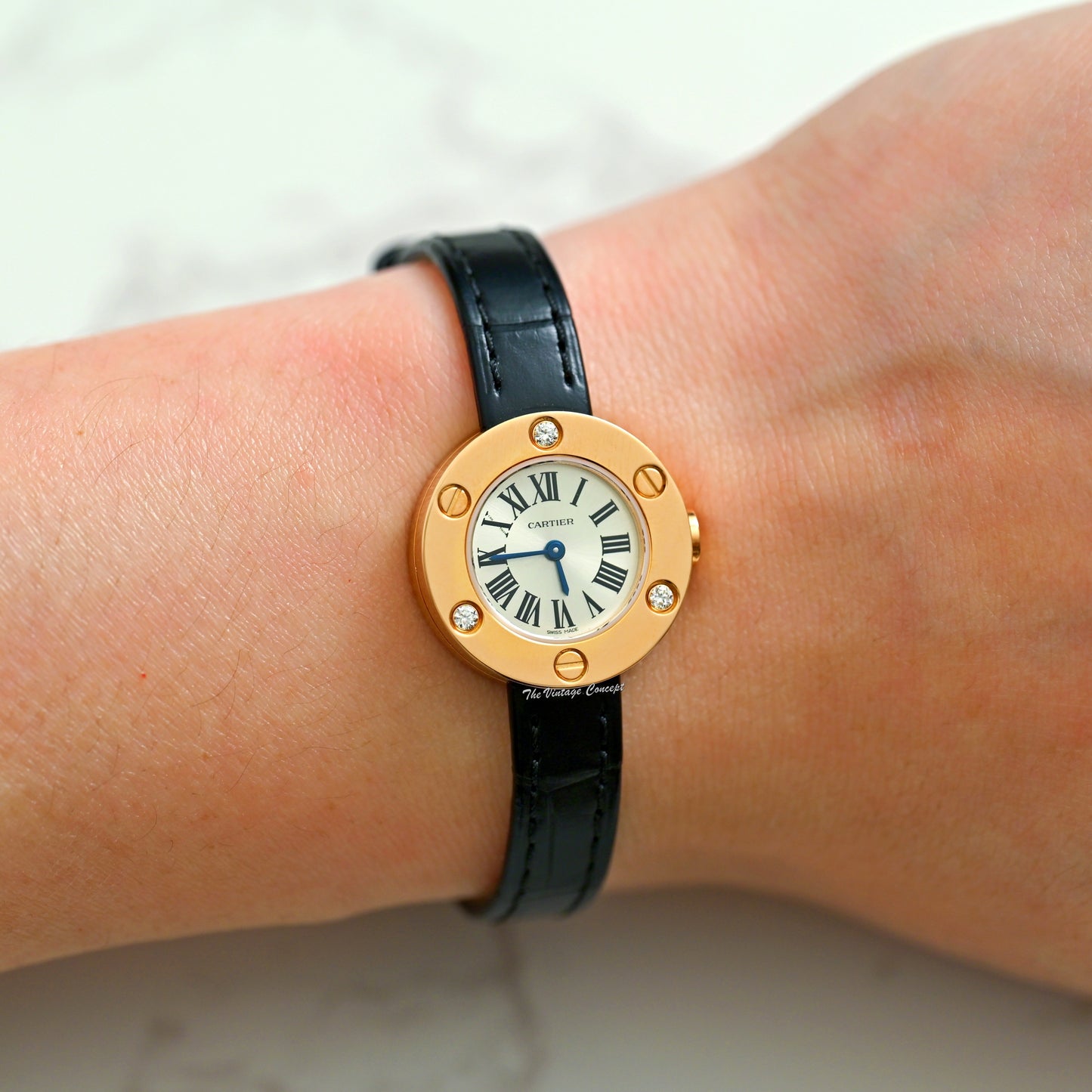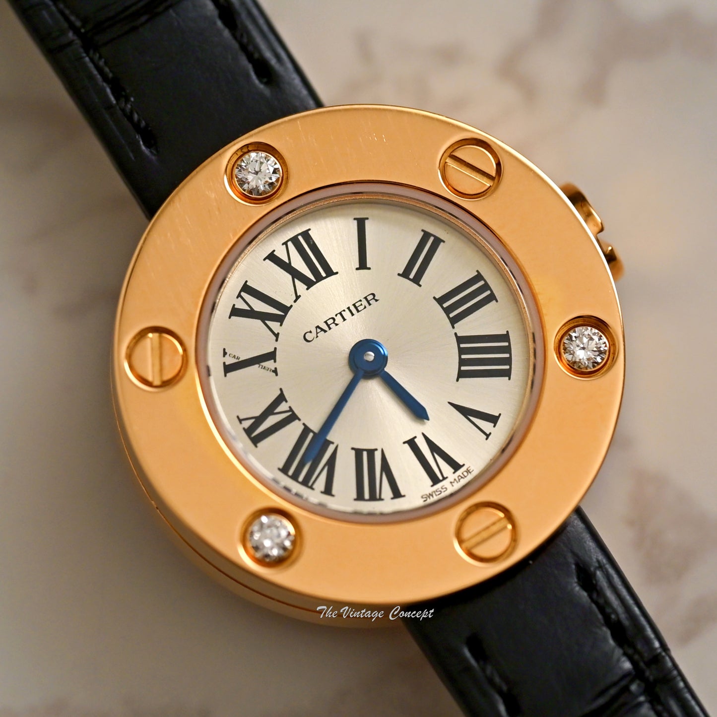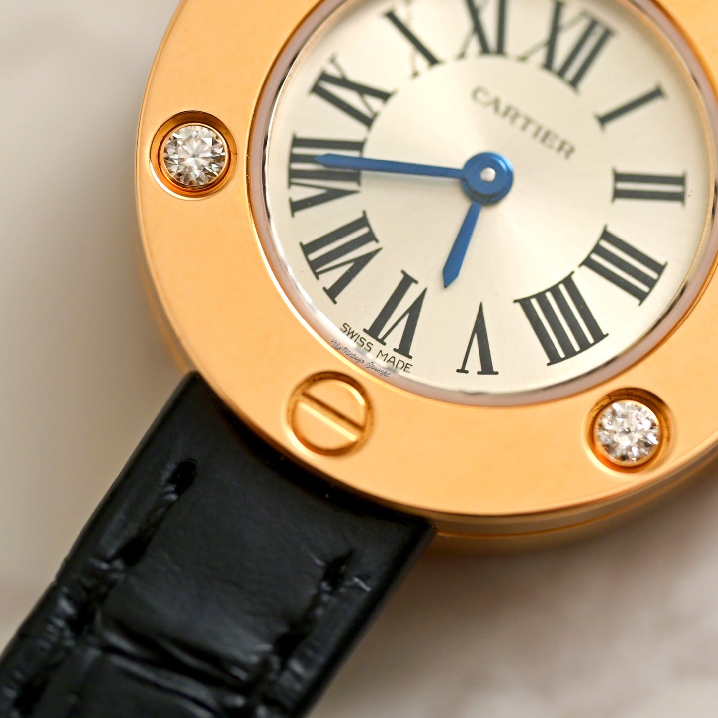 Dial: It features Cartier signature black roman numerals and blue steel hands