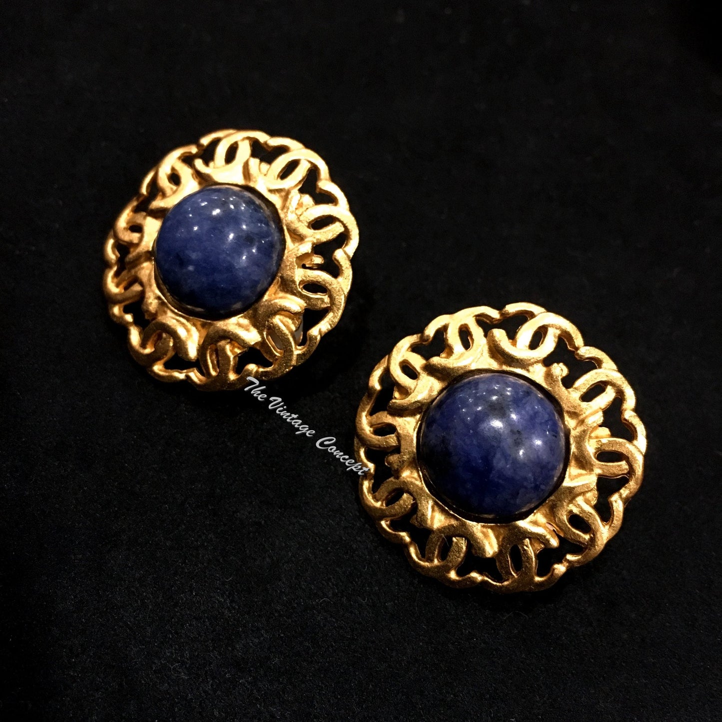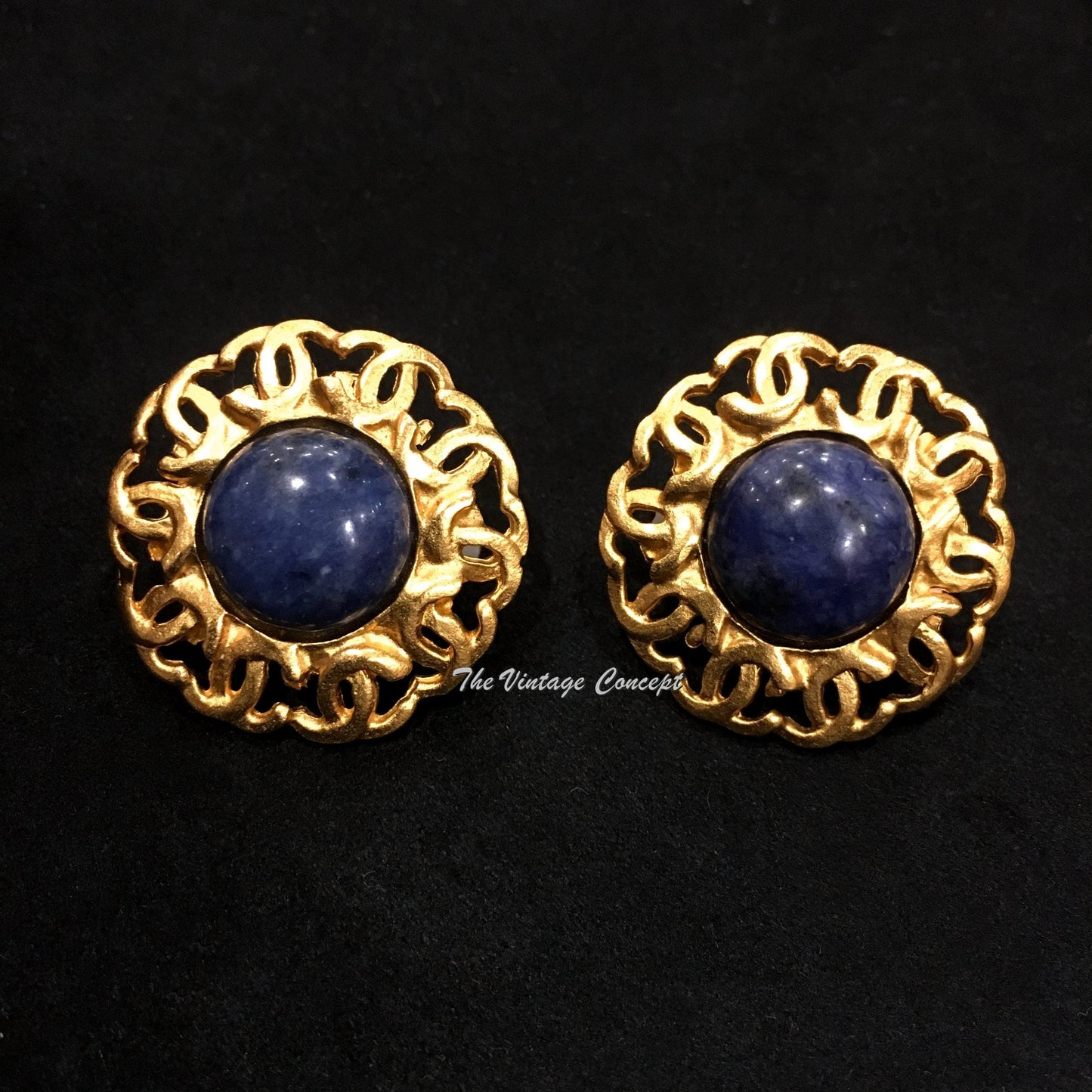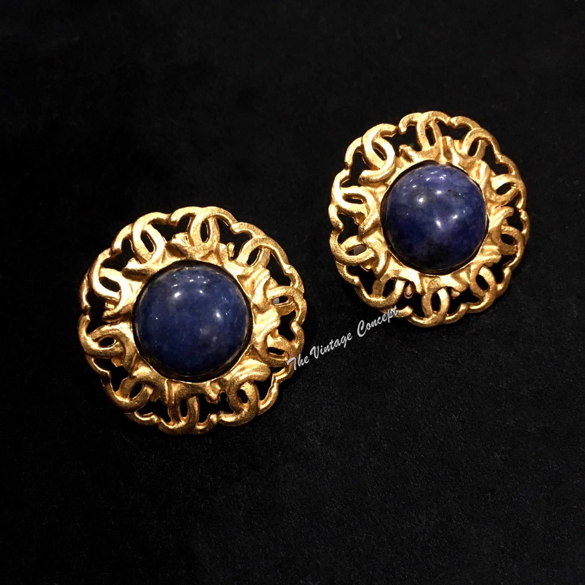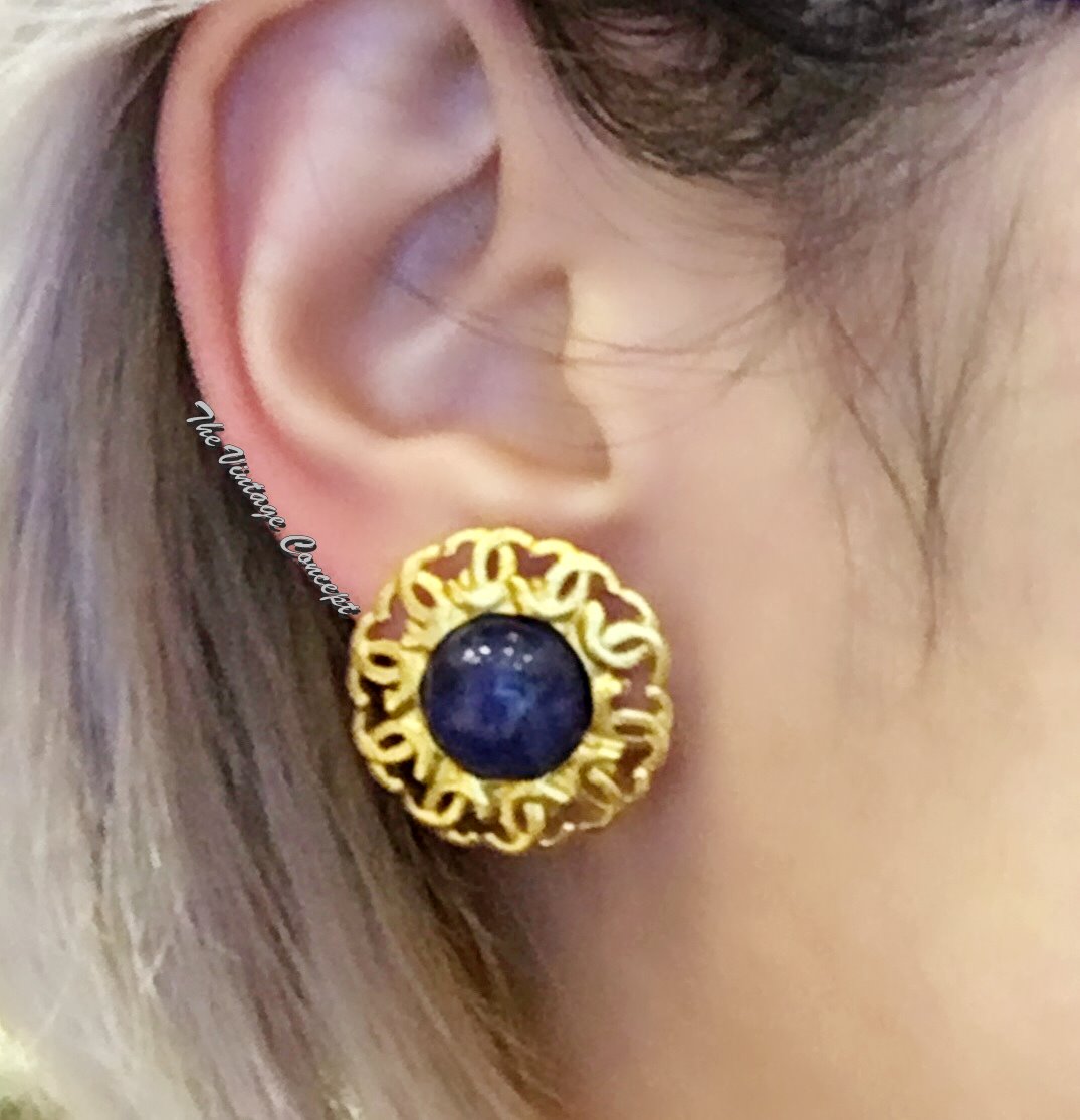 Chanel Gold Tone Blue Stone Logo Clip Earrings 95A (SOLD)