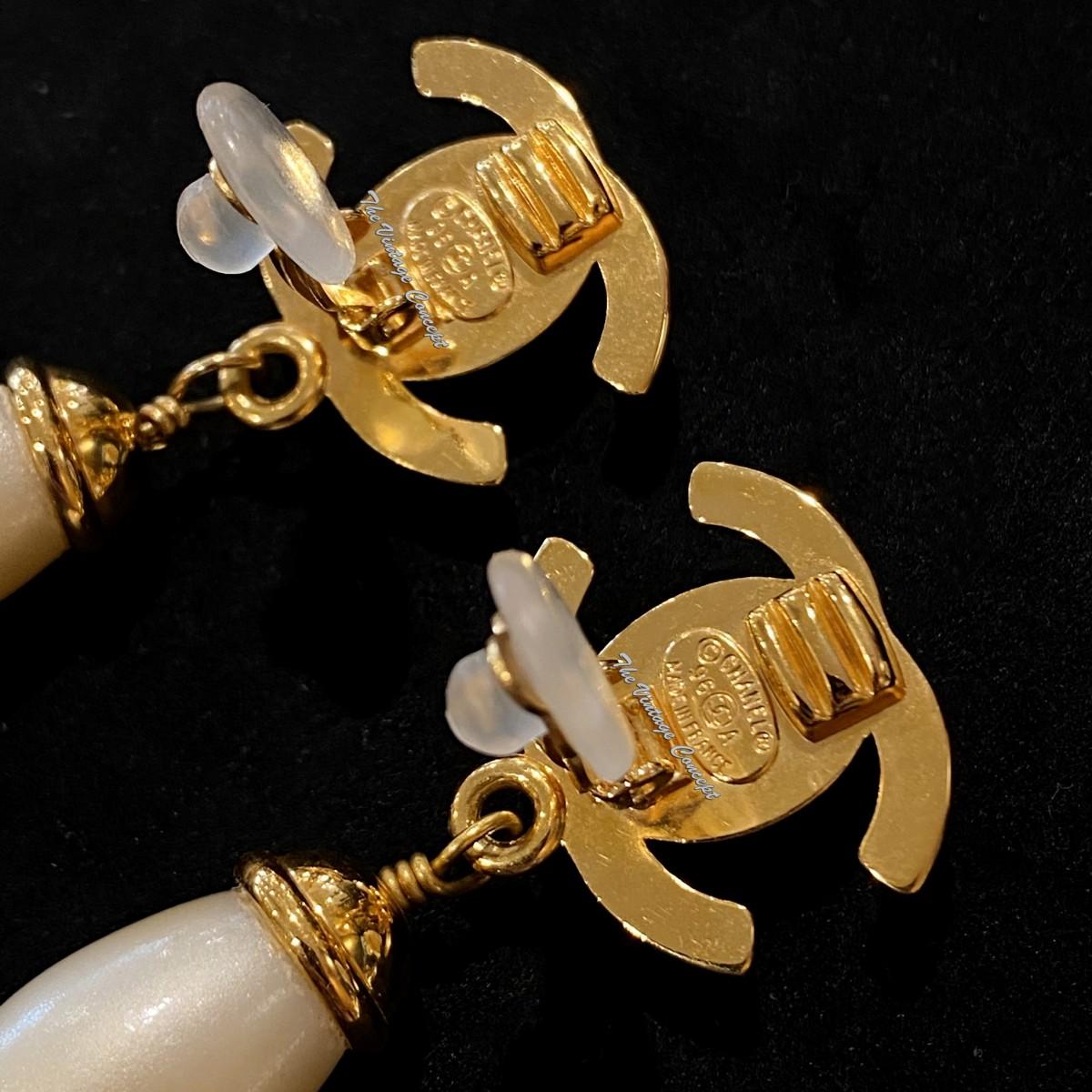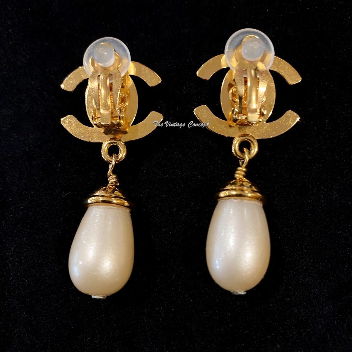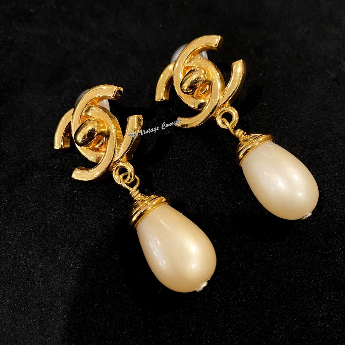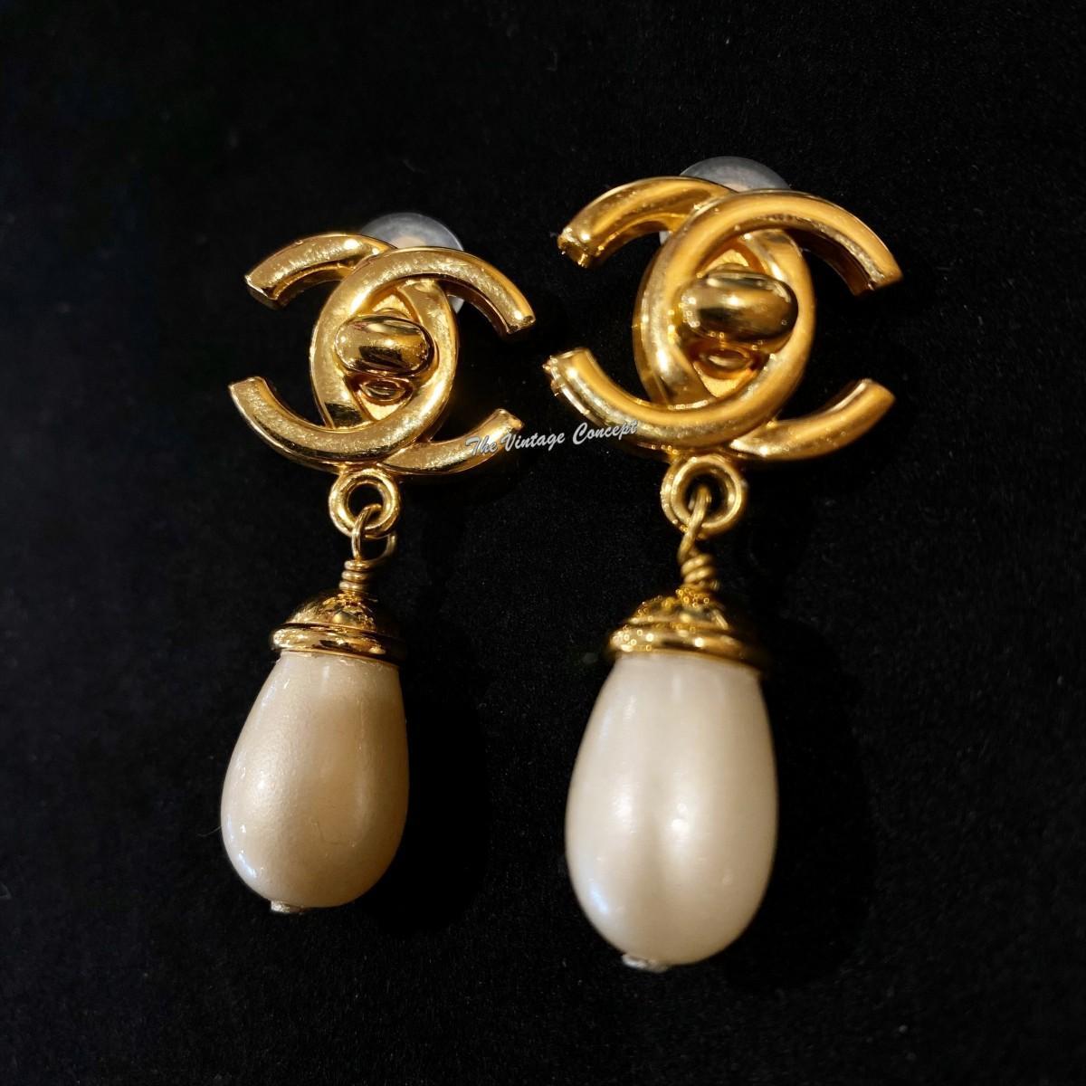 Chanel Gold Tone Turn Lock CC Logo Dangle Faux Pearl Clip Earrings 96A (SOLD)