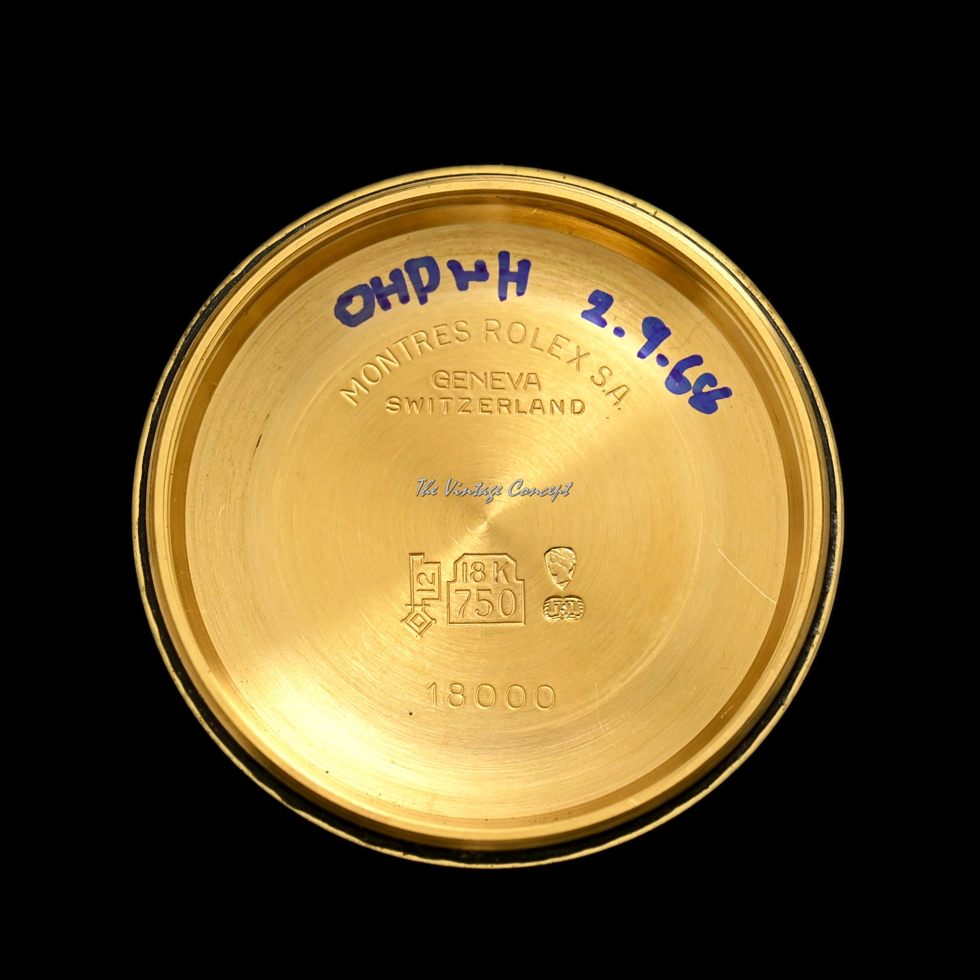Case: 36mm in diameter without crown; Show sign of wear with slight polish from previous w/inner case back stamped 18000.