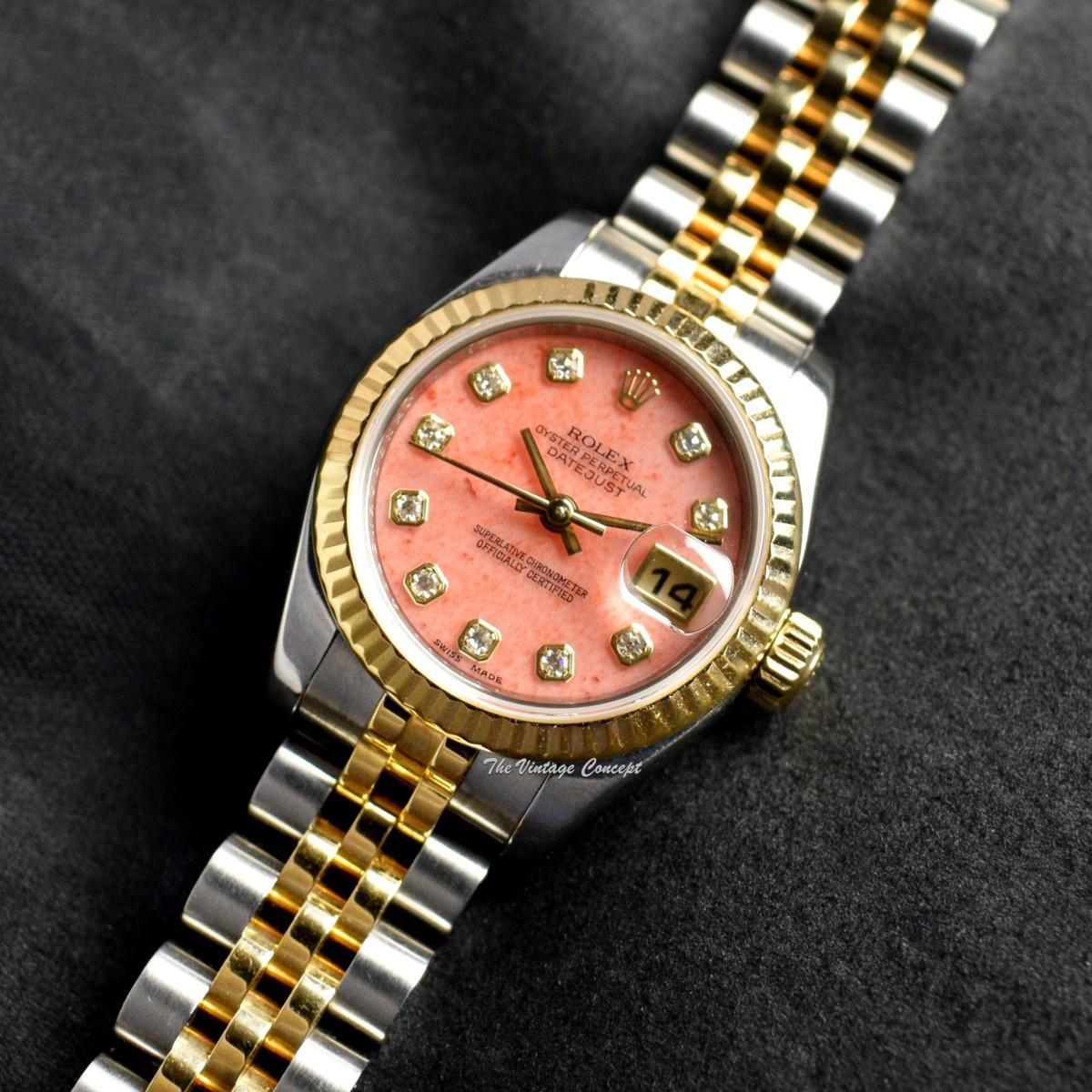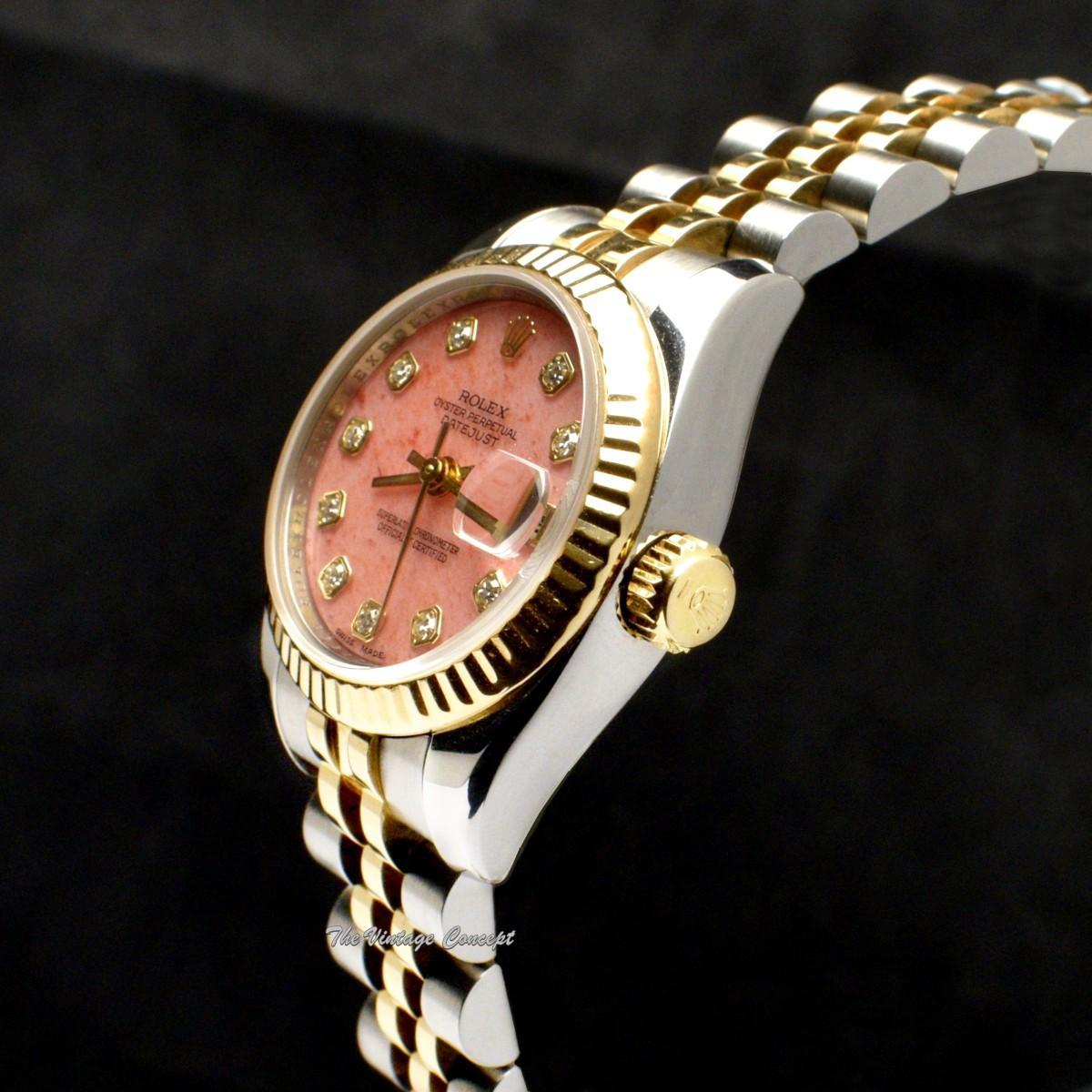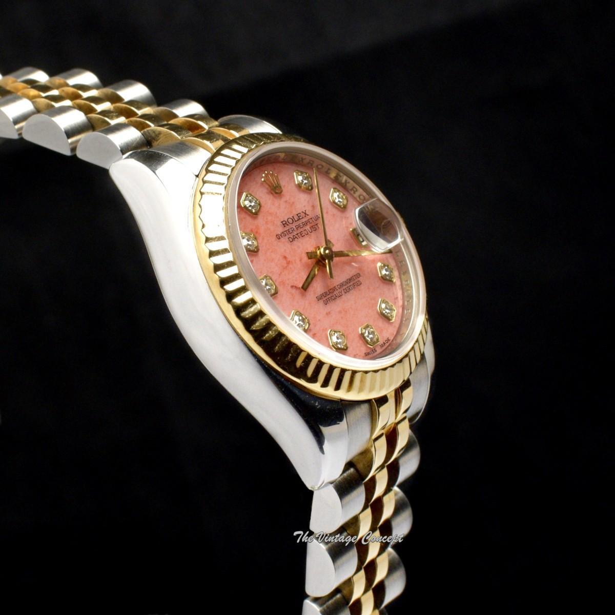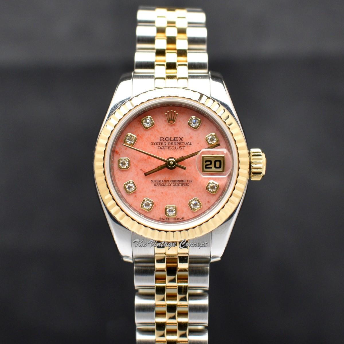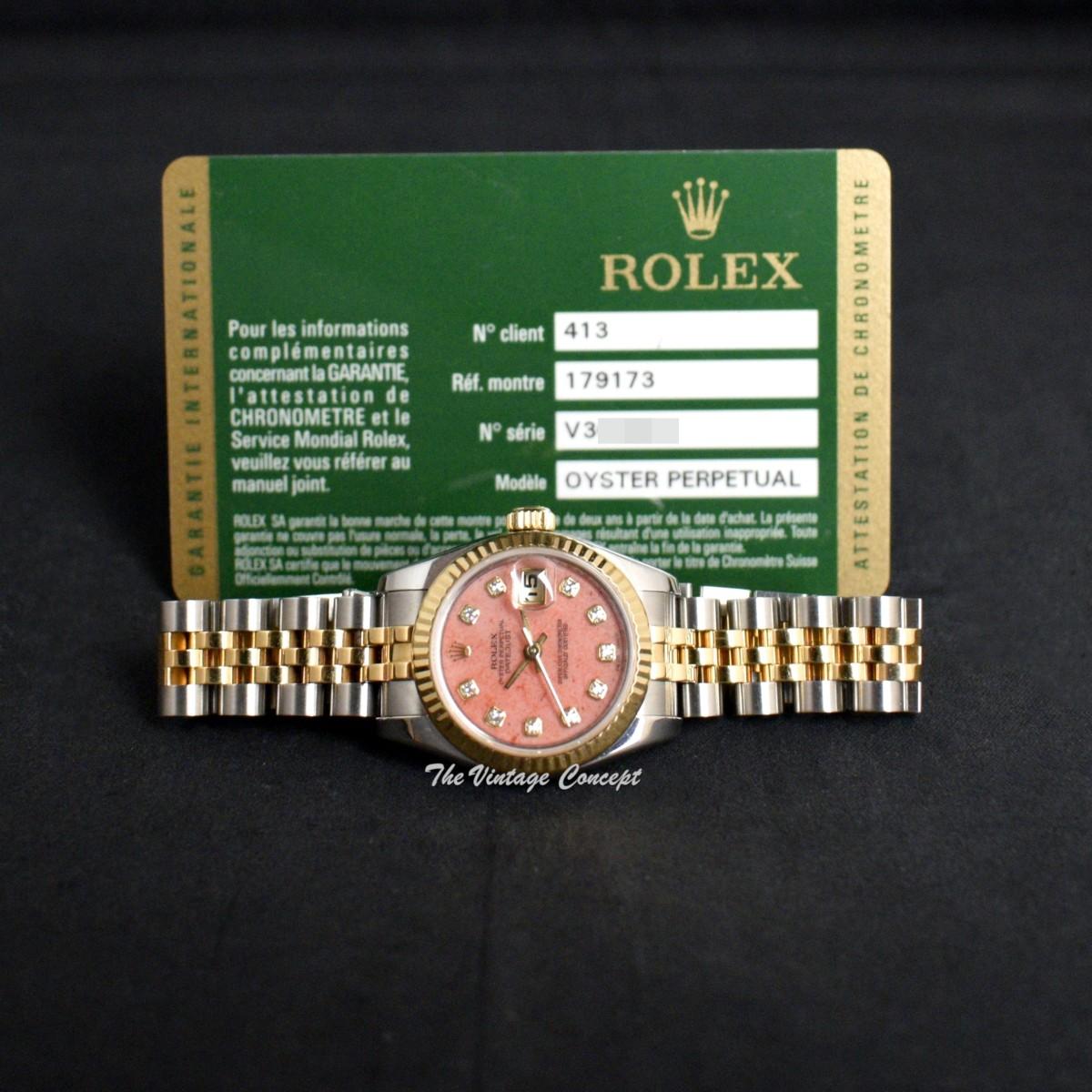Rolex Lady Datejust Yellow Gold & Steel Coral Stone Dial Diamond Indexes 179173 w/ Guarantee Card (SOLD)