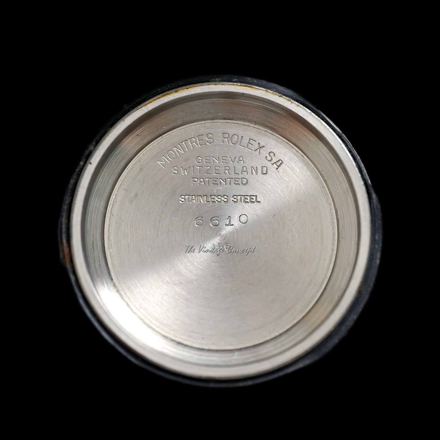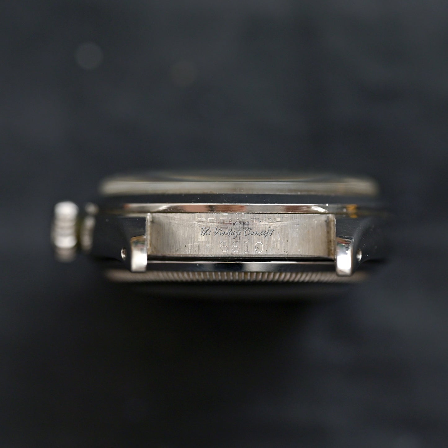 Dial: The Rolex 6610 gilt dial with chapter ring, in good aged condition, features the iconic 3-6-9 layout with luminous numerals and matching hands. This striking gold-toned printing enhances readability while showcasing timeless sophistication