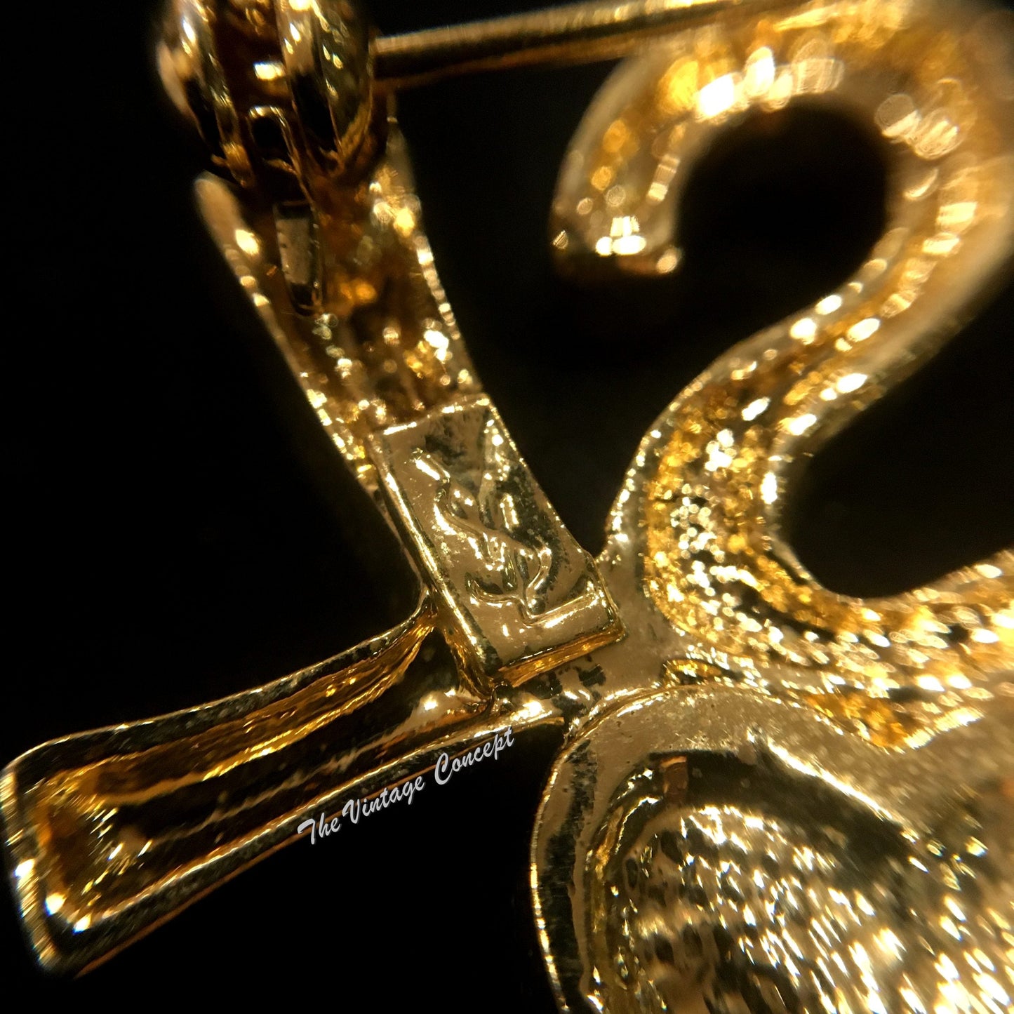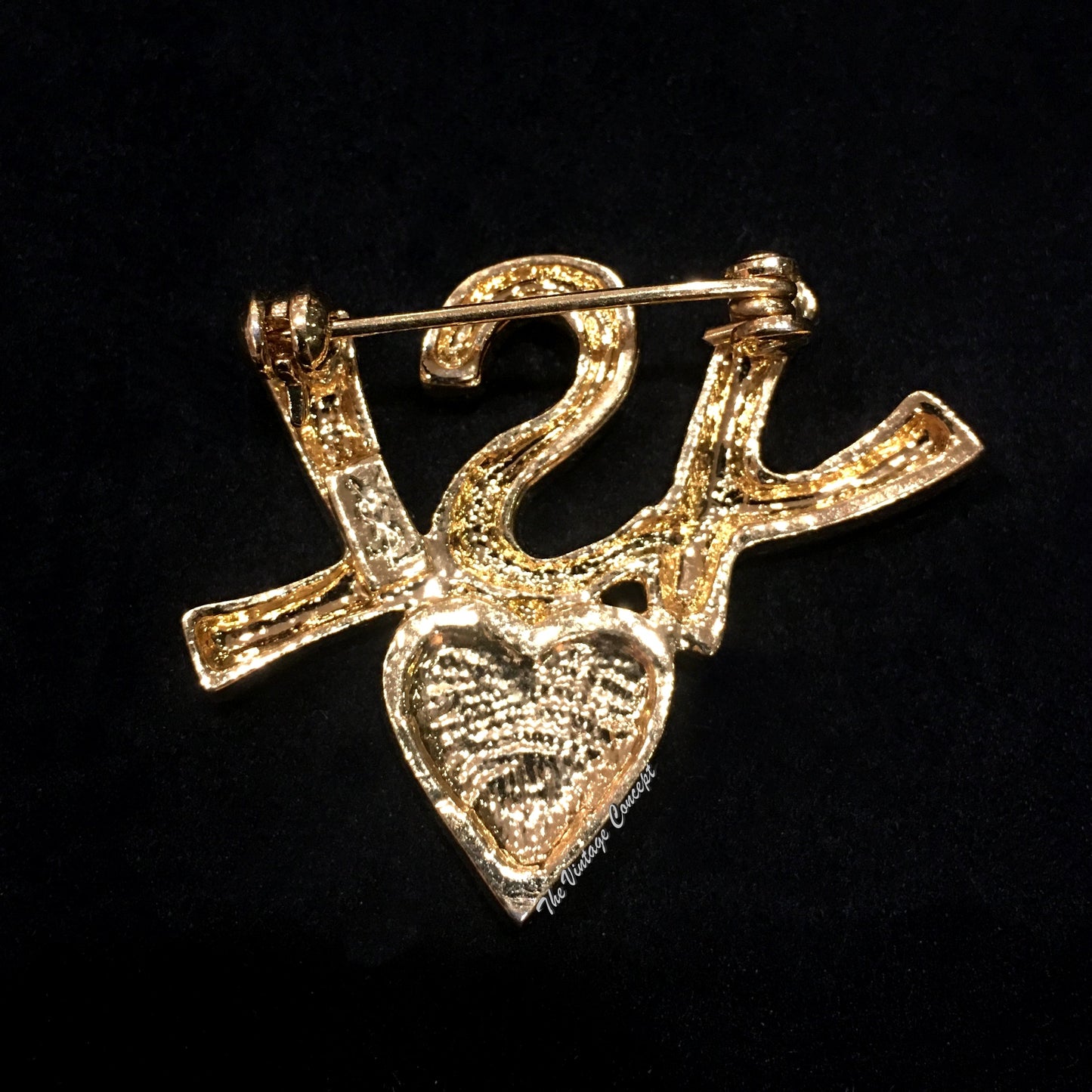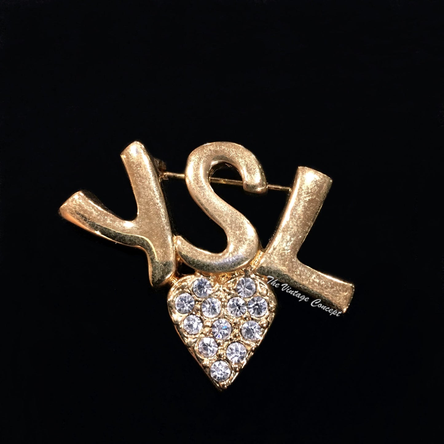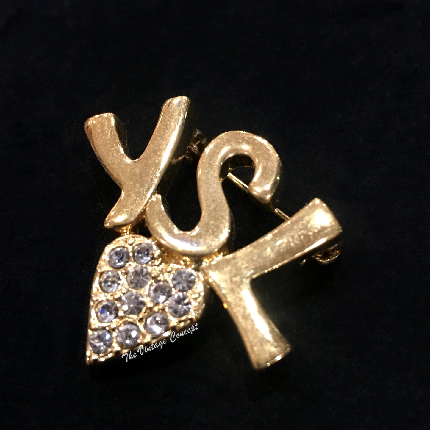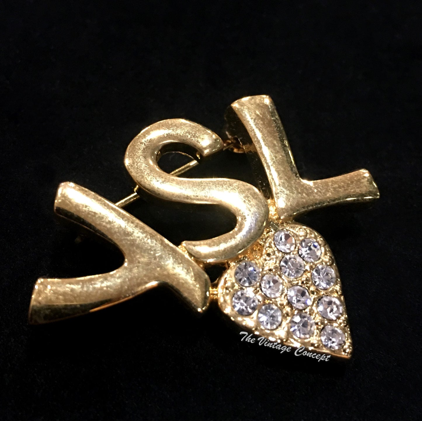 YSL Gold Tone Brooch w/ Heart Shape Rhinestone